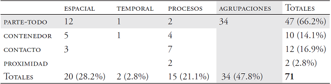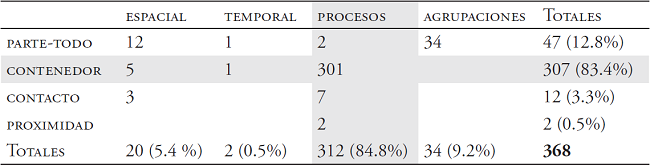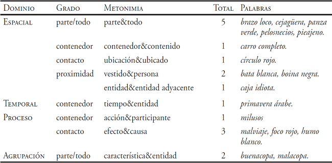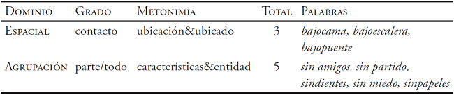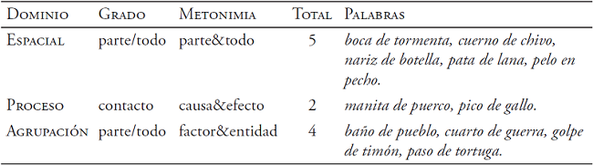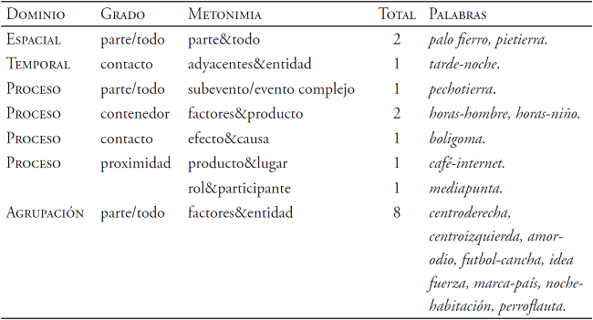 Basados en el Cuadro 1, donde se clasifican las metonimias según los ejes Dominio y Grado de contacto, en el siguiente cuadro se muestran los totales de compuestos por tipo de metonimia según los datos analizados en las secciones anteriores: