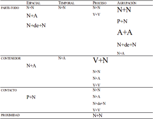 Puede observarse que, a partir de la relación prototípica parte/todo en el dominio espacial, la metonimia amplía su alcance, lo que permite incluir distintas relaciones entre palabras compuestas y elaborar una clasificación sistemática. El siguiente cuadro está tomado de Zacarías Ponce de León (2015: 72).