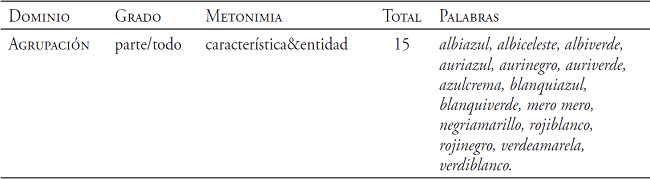 En este caso, del total del total de compuestos, analizamos 15 como metonímicos. La única relación metonímica encontrada es característica&entidad (agrupación, parte-todo). En todos los casos, se trata de una coordinación de adjetivos que se refieren a características agrupadas relevantes que se utilizan para denominar la entidad (rojinegro). No son muy productivos, probablemente porque el requisito de coordinar dos adjetivos restringe ampliamente la creación de nuevas unidades con este esquema.