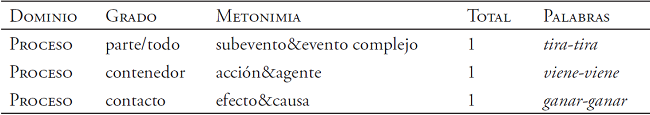 Puede observarse que el cuadro está dominado ampliamente por la metonimia acción&participante que se localiza en el dominio de los procesos y con un grado de contacto, contenedor. Esto se debe a que todos los compuestos V+N se han considerado metonímicos. Ya se mencionó anteriormente que la composición V+N puede analizarse también partiendo de una nominalización por reanálisis de la vocal temática (ver sección 4.1). Desde nuestro punto de vista, estos dos análisis no se oponen entre sí, sino que se complementan; consideramos que las nominalizaciones de este tipo están motivadas por la metonimia, como lo propone Gutiérrez Rubio (2014: 73).