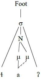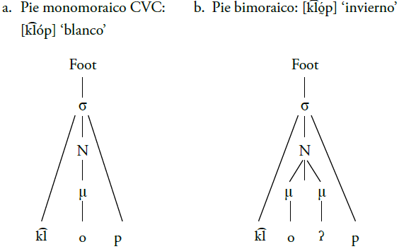 De esta manera, solamente una glotal posvocálica tiene un rol único en términos de prominencia. Con base en la observación de que las vocales glotalizadas del nivaĉle son consistentemente acentuadas, propongo que (i) la glotal oclusiva del nivaĉle es moraica, (ii) solamente las moras pueden ser analizadas como parte del núcleo (Shaw 1992, 1994) de la sílaba y que, en consecuencia, (iii) la mora asociada a la glotal posvocálica se asocia al núcleo de la sílaba, contribuyendo al peso silábico y atrayendo el acento en conformidad con el Principio de Peso-a-Acento (Weight-to-Stress Principle), (Prince & Smolensky 1993). En consecuencia, una palabra CVC como (3a-e), no es ni bimoraica ni disilábica, y así no conforma de manera transparente la restricción general de binariedad Ft-Bin - y por ende las restricciones particulares Ft-Bin-μ y Ft-Bin-σ. Sin embargo, propongo que CVC puede constituir tanto un pie como una palabra mínima. La palabra mínima del nivaĉle no es sensible al peso, sino a la forma cerrada de la sílaba: CVC. De modo crucial, a diferencia de una palabra CVC, una palabra monosilábica CV no puede conformar una palabra mínima y tampoco puede funcionar como un pie en el sistema acentual de la lengua. Es decir, solo una palabra monosilábica CVC puede recibir acento primario. Por su parte, en una palabra polisilábica, un pie que satisface Ft-Bin-( recibe acento primario, mientras que un pie CVC recibe acento secundario. De esta manera, postulo que la cabeza de una Palabra Prosódica es óptimamente binaria a nivel silábico.