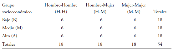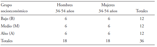 La muestra recoge narraciones de hablantes santiaguinos (cf. Prieto 1995-1996) cuyas edades oscilan entre los 35 y los 54 años. Siguiendo a Blas Arroyo (2005), se trataría de hablantes que coinciden en la etapa vital en que los sujetos se desarrollan laboralmente de forma plena y que, además, han demostrado ser el grupo más sensible a la variación en la variedad santiaguina (Guerrero González 2014). La muestra se organizó en un sistema de cuotas con afijación uniforme (López Morales 1994), tal y como se ilustra en las siguientes tablas: