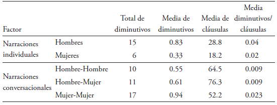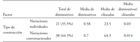 En total, en los 90 discursos analizados se identificaron 59 ocurrencias del fenómeno en estudio. De estas, 21 se hallaron en las narraciones individuales y 38 en las conversacionales. Pese a que evidentemente en estas últimas el fenómeno se halló más veces, al considerar la división por cláusulas, la media del índice de ocurrencia es de 1.26 diminutivos por cláusula en las narraciones individuales y 0.01 en las conversacionales. La diferencia se debe a que en las narraciones conversaciones hay una mayor cantidad de cláusulas por cada relato. Este índice permite revisar si el discurso se encuentra más o menos atenuado.