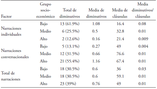 Del gráfico precedente, se observa que en el total de las narraciones y en las individuales son los hablantes de los grupos socioeconómicos bajos quienes utilizan más este recurso, lo que no es apreciable en las narraciones conversacionales. Frente a esto, se ha de destacar que los datos no son estadísticamente significativos (para las narraciones individuales: p=0.1; para las conversacionales: p=0.3; para el total de las narraciones: p=0.3). Si bien se podría sostener que esto de igual forma contrasta con la idea de que son los grupos socioeconómicos altos los que más atenúan (cf. Cestero 2011), es relevante recordar que los diminutivos constituyen solo uno de los tantos recursos que sirven para ese fin, por lo que aquella idea puede ser cierta sin desmedro del panorama que se presenta de este recurso.