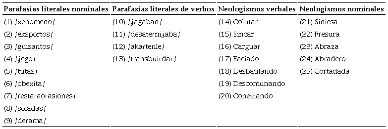 Para el análisis, el corpus se dividió en dos tipos de alteraciones lingüísticas: (i) parafasias literales y (ii) neologismos. Las parafasias literales, también reconocidas en la literatura neuropsicológica como parafasias fonémicas o fonológicas (Ardila 2006, 2008, 2014; Ahlsén 2006), se asocian con pseudopalabras o no-palabras que son incorrectas desde el punto de vista de la composición de los segmentos fonológicos que la conforman (Ardila 2014). En esta línea, la producción de parafasias literales se relaciona con una secuencia fonémica inadecuada en una palabra, cuya manifestación lingüística puede corresponder a omisiones, adiciones, desplazamientos o sustituciones de los segmentos fonológicos (Ardila 1992: 2). Suelen aparecer en palabras que son aproximaciones de una palabra meta -por semejanza sonora- (Sánchez 1990); así, un paciente podría producir carretilla por cajetilla (Ardila 1992).