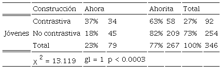 No obstante, hay que notar que la gran proporción de uso ahorita en el caso de los jóvenes se debe en parte al bajo conteo de contextos contrastivos en el habla de estos: 92 casos contrastivos contra 254 no contrastivos; en el resto de las generaciones, la diferencia entre ambos tipos de oraciones no es tan marcada. Asimismo, hay que observar que, en el caso de los jóvenes, la frecuencia de uso de ahora en construcciones contrastivas es cerca del doble (37 %) de la empleada en estructuras no contrastivas (18 %); esta proporción se mantiene constante en las tres generaciones.