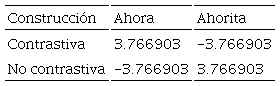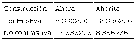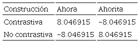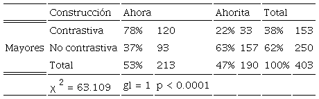 Con respecto a los hablantes mayores, la prueba de independencia arroja un valor significativo (p < 0.0001), por lo que se puede concluir que, para esta generación de hablantes, el tipo de construcción influye en la elección que se hace entre ahora y ahorita. Un análisis post-hoc de los residuales,4 además, permite observar que existen dos asociaciones positivas: por una parte, la del adverbio simple con las construcciones contrastivas (residual > 8), y por otra, la de ahorita con las estructuras no contrastivas (residual > 8).