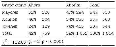 Este factor fue probado también con un ji cuadrado, el cual arroja un valor significativo (p < 0.0001), por lo que se concluye que el grupo etario al que pertenece el hablante está correlacionado con el uso que se hace de ahora y ahorita, es decir, mientras más joven sea un hablante, mayor será su uso del adverbio con diminutivo; esto implicaría, además, que existen diferencias en las gramáticas subyacentes de los distintos grupos de hablantes.