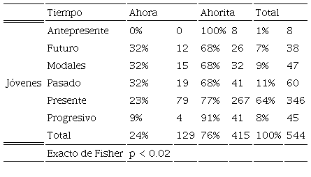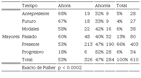 La relación entre los distintos tiempos gramaticales y el uso de ahora y ahorita fue analizada para cada grupo etario, además, a través de una prueba de independencia de Fisher.1 Se halló que, en el caso de los hablantes mayores y los adultos, la prueba de Fisher arrojaba valores significativos (p < 0.0002 y p < 0.007, respectivamente), por lo que se concluye que, para estas generaciones, el tiempo gramatical influye de manera significativa en la elección que hacen los hablantes entre ahora y ahorita.