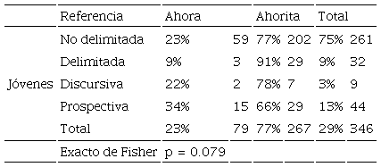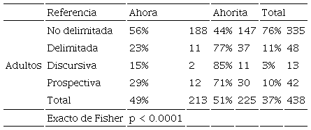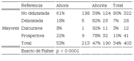 La relación entre los distintos tipos de referencia y el uso de ahora y ahorita fue analizada para cada grupo etario con una prueba de independencia de Fisher. Con respecto a los hablantes mayores y adultos, la prueba arrojó valores significativos (p < 0.0001 en ambos casos), lo que implica que, efectivamente, el tipo de referencia influye en la elección que hacen los hablantes de estas generaciones entre ahora y ahorita; sin embargo, en relación con los hablantes jóvenes, el valor arrojado fue no significativo (p > 0.07), lo que comprueba que para esta generación la elección del adverbio es independiente del tipo de referencia.
