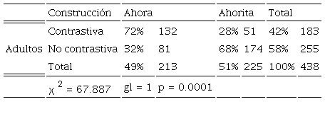 Para los hablantes adultos, de este modo, existen las mismas asociaciones positivas que para los mayores: por una parte, entre ahora y las construcciones contrastivas (residual > 8), y por otra, entreahorita y las no contrastivas (residual > 8). Así, los adultos elegirán ahoritaen contextos que se limiten a describir el presente (17a), mientras que ahora tenderá a aparecer en los casos en los que el establecimiento de contraste requiera una escala temporal grande en la que el momento del habla no sea un punto de referencia relevante (17b).