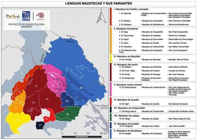 Con base en el Proyecto Nanginá se presenta una nueva propuesta dialectal de 10 lenguas mazatecas, o zonas de inteligibilidad, y 20 variantes (ver Chávez Peón; Wagner; Filio & García 2021). Los principales criterios de dicha propuesta son de carácter lingüístico, en relación con las diferencias y similitudes de los sonidos entre variantes, pero también tomamos en cuenta aspectos históricos y morfológicos, la división política de los municipios y la identidad comunitaria de sus hablantes. La Figura 2 muestra el mapa con esta propuesta dialectal, seguida del Cuadro 1 que recopila esta información.