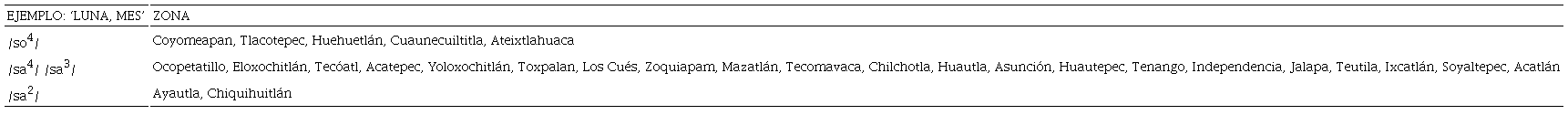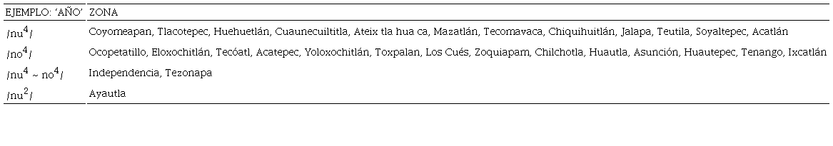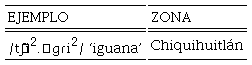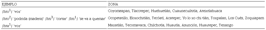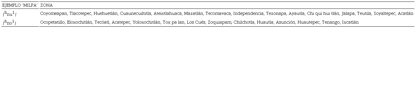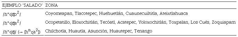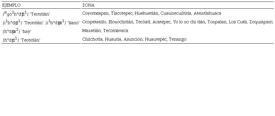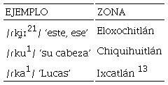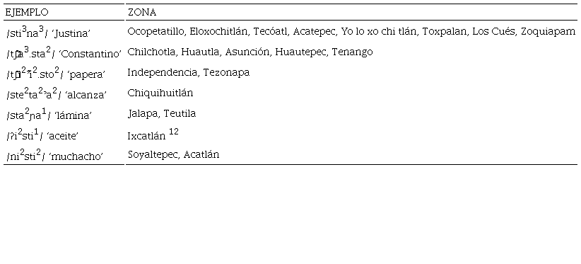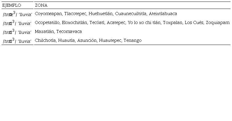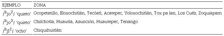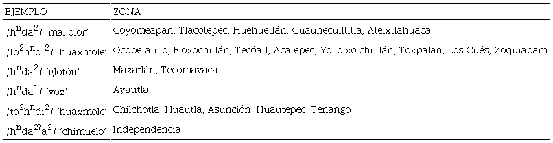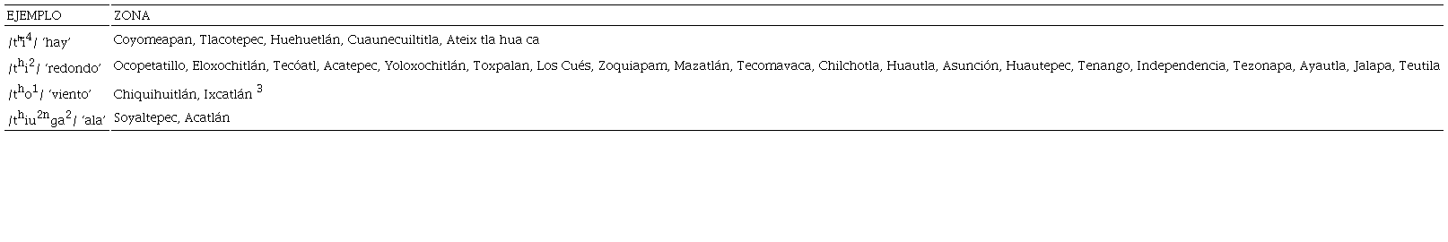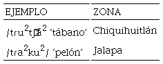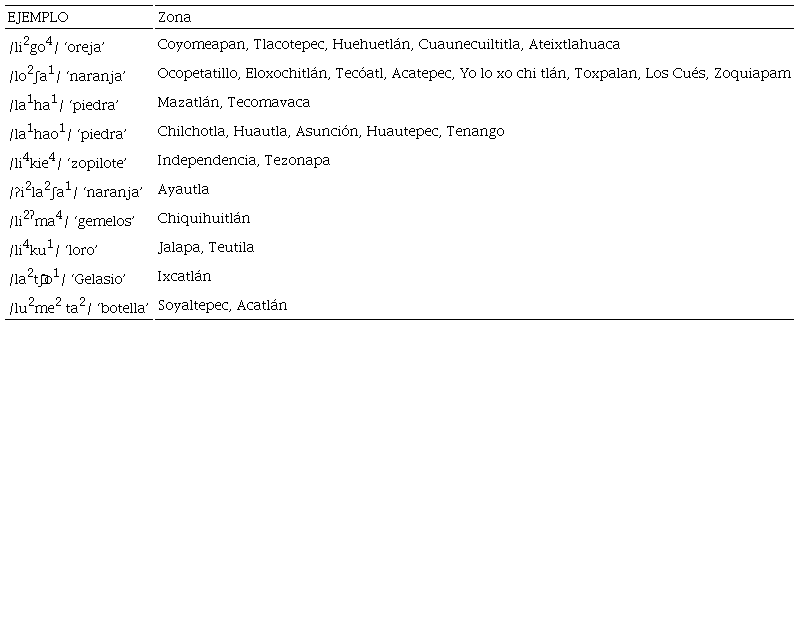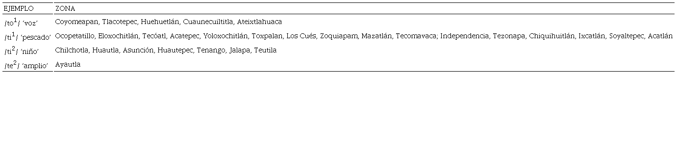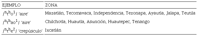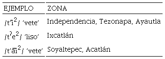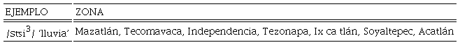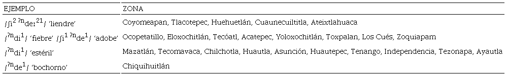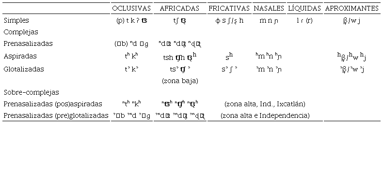 En contraste, para Ayautla5 (zona VI), zona de transición, así como para los municipios de Independencia (zona V), Ixcatlán (IX) y Acatlán-Soyaltepec (X) dentro de la zona baja, se considera la existencia de consonantes glotalizadas. Consonantes que se alinean a la fonotáctica de un inicio simple y se ilustran a continuación.