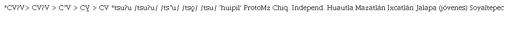 En esta cadena evolutiva incluimos la protoforma *CVʔV (Kirk 1966: 232), que se mantiene en algunas palabras para ciertas variantes, como Chiquihuitlán. De ahí, en la zona baja (salvo Jalapa) la pérdida de la primera vocal (átona) provocó la adyacencia de la plosiva y la glotal, que analizamos aquí como una consonante glotalizada (en línea con Wagner 2018 para Ixcatlán). En la zona alta encontramos cierta fluctuación entre sonidos eyectivos y voz laringizada, como en Huautla, hasta llegar a la pérdida del rasgo [+g.c.] como el caso del habla juvenil de Mazatlán (Filio 2014; Klint & Filio 2018: 4).4