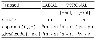 (14) Plosivas prenasalizadas posaspiradas [+cons., -resonante, -continuo, +nasal, +g.e.]
