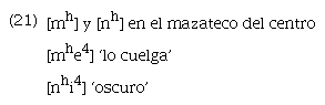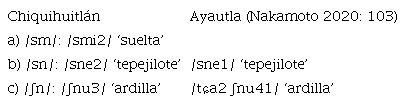 Esta restricción se observa también en las secuencias observadas de fricativa más nasal en los mazatecos de Chiquihuitlán y Ayautla, que junto con las secuencias de fricativa + plosiva conforman secuencias de segmentos C[+cont]C[-cont].