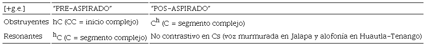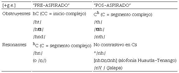 Para el caso de la aspiración, García, Chávez Peón & Polian (2012) y García (2013) proponen que el gesto “pre-aspirado” de las consonantes se trata en realidad de una secuencia CC, mientras el gesto pos-aspirado, se trata en efecto de una consonante compleja. En el presente trabajo, sin embargo, hace mos una precisión mayor, al dividir las clases naturales de obstruyentes y resonantes; mientras la propuesta mencionada aplica para las obstruyentes, dentro de las resonantes, la preaspiración sí constituye un rasgo secundario alineada a la izquierda del segmento, mientras que el gesto de aspiración pos-resonántico es inexistente para la gran mayoría de las variantes, solo se encuentra en Jalapa y en Huautla. En Jalapa corresponde al rasgo vocálico de voz murmurada, mientras que en Huautla se trata de un caso de alofonía, como una posible realización de un único fonema aspirado: /hn/ (o /n̤/) → [hn~n̤~nh]. Lo anterior se esquematiza de manera unificada y general en el Cuadro 30 y, como se mostró en el trabajo, da lugar a las secuencias consonánticas descritas.