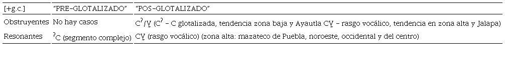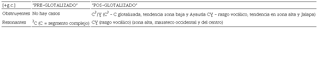 El gesto de glotalización a la izquierda de las obstruyentes no existe en las lenguas mazatecas, es decir, no hay obstruyentes preglotalizadas, ni tampoco posibles secuencias de glotal + obstruyente. Más adelante se describirá la distribución del rasgo [+g.c.] en las resonantes.