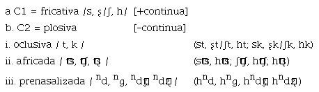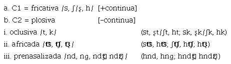 Una vez establecida la distribución de los rasgos laríngeos, en la sección de inicio complejo se detallaron los casos de secuencias permitidas en las lenguas mazatecas, en esencia fricativa más plosiva. Como C1, encontramos a las fricativas: /s, ʃ/ʂ, h/, todos segmentos [+continuo]; como C2, esta posición la pueden ocupar una amplia gama de la clase de plosivas (segmentos [-continuo]): oclusivas simples, africadas y prenasalizadas. Repetimos a continuación el siguiente esquema que resume esta descripción.