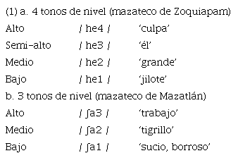 Las lenguas mazatecas son lenguas tonales, los sistemas cuentan con 3 o 4 tonos de nivel básicos más secuencias de contorno a partir de estos tonos. Las lenguas de la zona alta suelen presentar 4 tonos de nivel, como Zoquiapam, frente a 3 en las zonas media y baja, como Mazatlán o Jalapa, ilustrado en los siguientes ejemplos (Norma de escritura del mazateco: 62; en Chávez Peón & Hernández 2021 puede consultarse un análisis fonético de estos tonos):