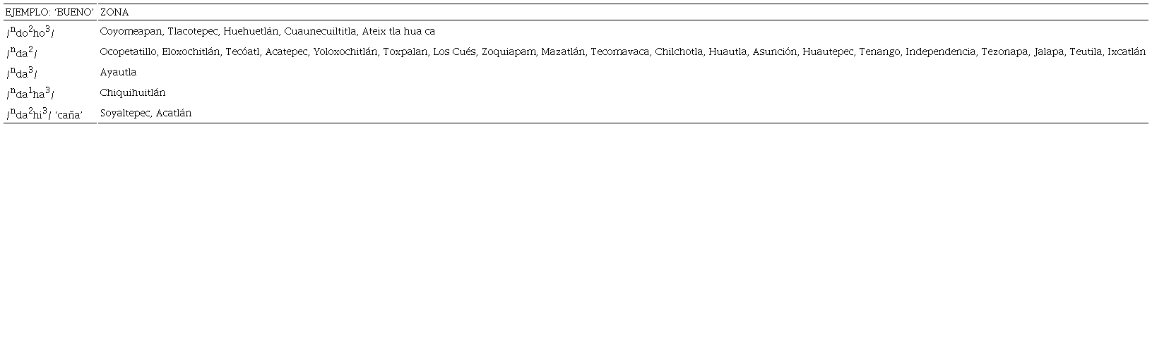 La alternancia de la fricativa posalveolar sorda /ʃ/ y su contraparte retrofleja /ʂ/ divide a la zona alta, con el fonema retroflejo, del resto de las variantes (zona media y baja). El resto de los fonemas africados retroflejos pertenecen solo a la zona alta (marcados en rojo). Otros fonemas predominantemente de esta zona o de algunas variantes de esta zona son la fricativa posaspirada / sʰ /, las resonantes preaspiradas / hβ̞/hw, hj / (la labial solo en Huautla-Tenango), así como la lateral preglotalilzada / ˀl / (particularmente en Zoquiapam, por ejemplo / ˀli / ‘fuego’).