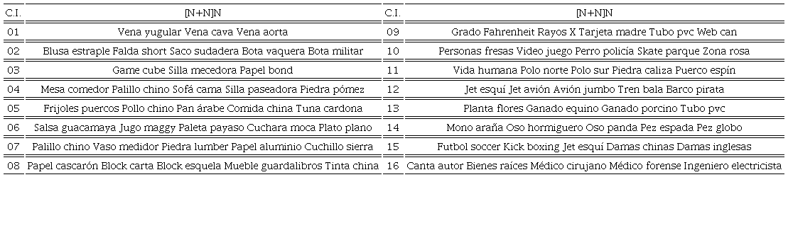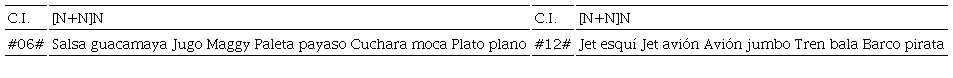 En relación con el compuesto sintagmático del tipo [N+N]N, su aparición en los corpus de disponibilidad es menor en comparación con los otros dos. Este está constituido por dos nominales que en apariencia forman una aposición y no presentan un significado idiomático. Entre sus características, el primer nominal es considerado el núcleo y el segundo restringe el aspecto material o el comportamiento denotado por el primero. El segundo nominal, que sirve de especificativo, brinda información adicional del sustantivo que funge como núcleo. Se representa así (X+x). Entre sus características semánticas, los dos nominales son congruentes semánticamente, ya que pertenecen a un mismo dominio conceptual, mostrando así un fuerte grado de cohesión semántica en el compuesto. Como ejemplo de esto, se presenta la distribución de este tipo de compuestos en los centros de interés #06# Objetos colocados sobre la mesa y #12# Medios de transporte.7