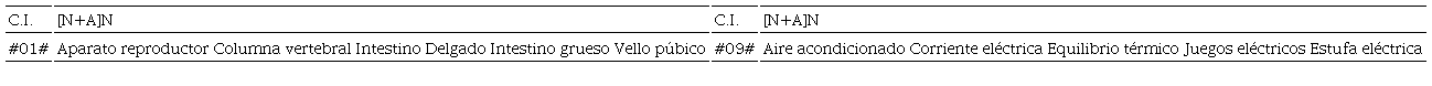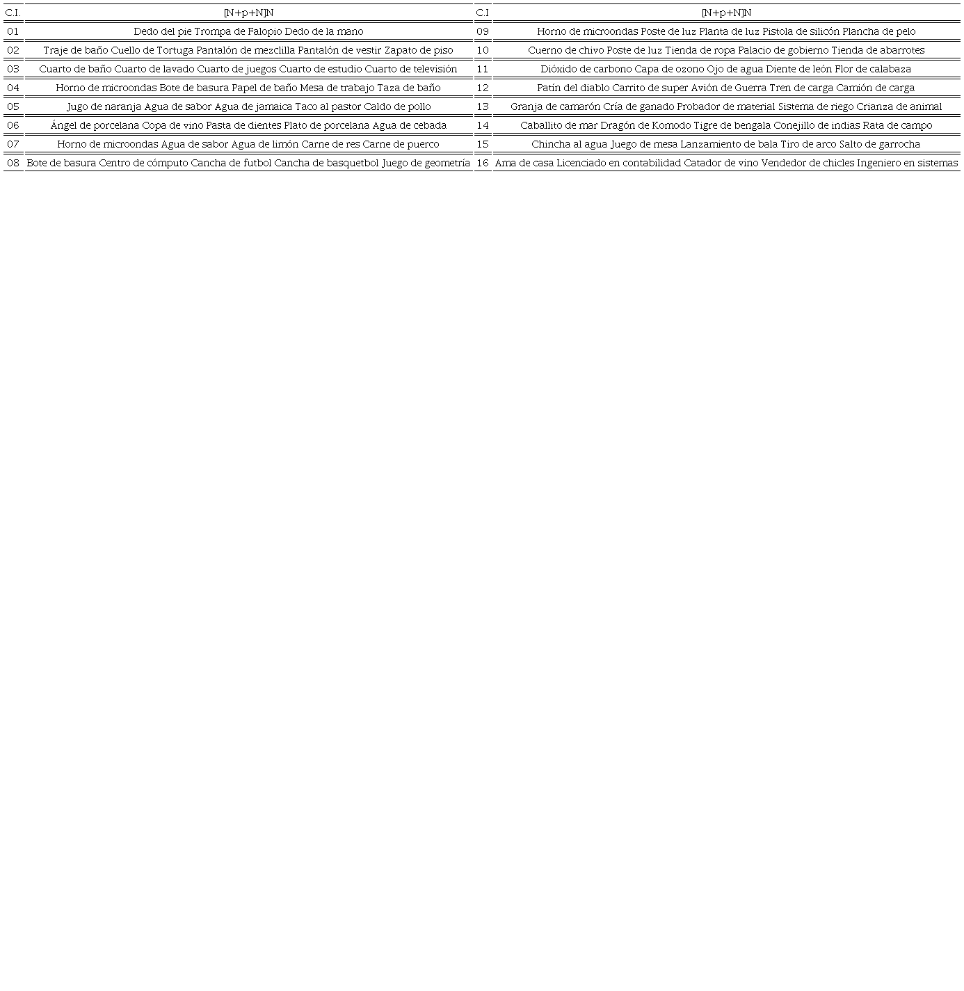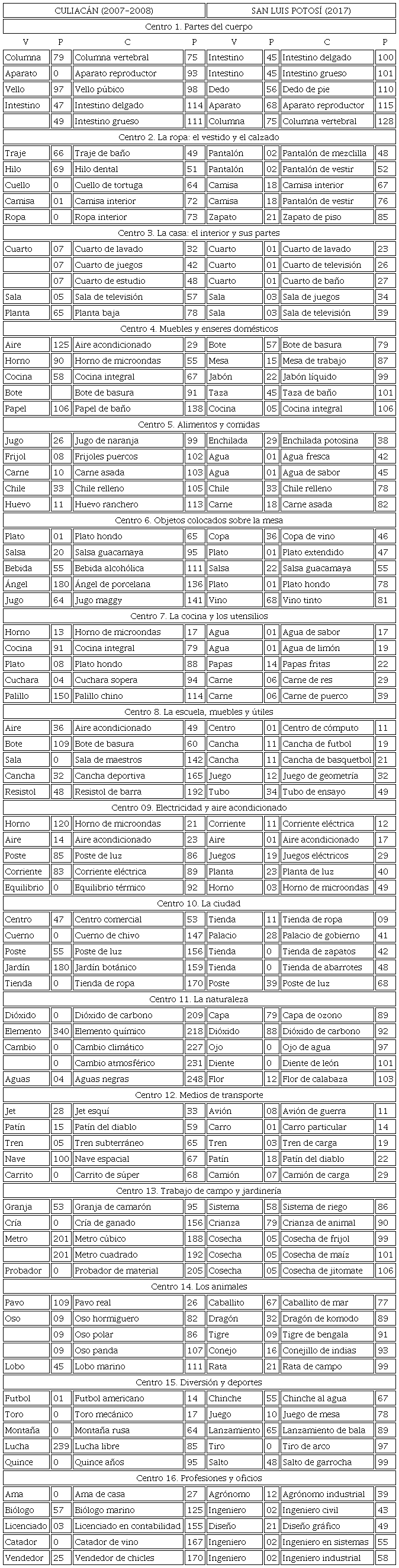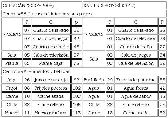 Enseguida se presenta la distribución de los compuestos sintagmáticos por centros de interés: #01# Partes del cuerpo, #02# La ropa: el vestido y el calzado, #03# La casa: interior y sus partes, #04# Muebles y enseres domésticos, #05# Alimentos y bebidas, #06# Objetos colocados sobre la mesa, #07# La cocina y los utensilios, #08# La escuela, mueble y útiles, #09# Electricidad y aire acondicionado, #10# La ciudad, #11# La naturaleza, #12# Medios de transporte, #13# Trabajo de campo y jardinería, #14# Los animales, #15# Diversión y deportes y #16# Profesiones y oficios. Para comprender la tabla de información se usaron los siguientes criterios: (P) representa posición, (C.I.) centro de interés, (SC) secundaria en Culiacán y (SSLP) secundaria en San Luis Potosí.