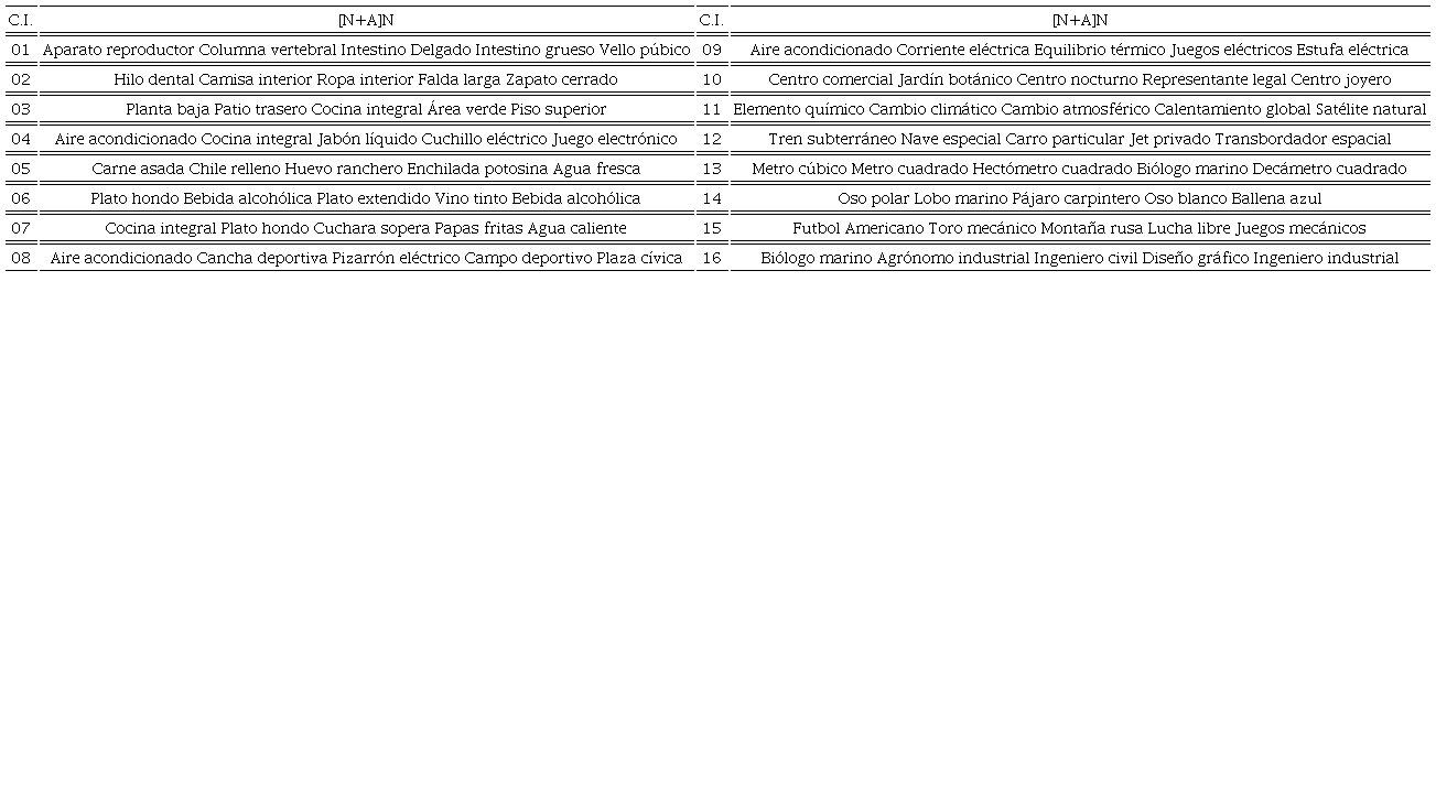 En lo que se refiere a los compuestos sintagmáticos del tipo [N+A]N, el primer constituyente es considerado el núcleo y el segundo el determinante, tal como se ha mencionado en párrafos anteriores. La posición del adjetivo (A) contiene una función clasificadora e intensificadora de lo que expresa el sustantivo, por ejemplo, en biólogo marino, marino aporta el sentido clasificador y, de cierta forma, especificativo del núcleo, lo mismo sucede con oso polar u oso blanco. Así, estos compuestos designan una realidad (+/-humana, +/-animada) que fortalece la cohesión semántica de estas estructuras. Como ejemplo de esto, se presenta la distribución de este tipo de compuestos en los centros de interés #01# Partes del cuerpo y #09# Electricidad y aire acondicionado.5