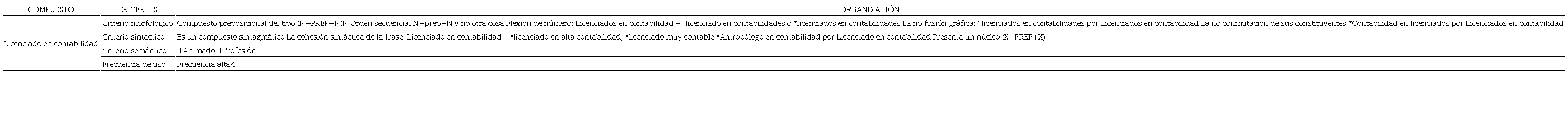 La metodología de este trabajo es de tipo cuantitativo, aplicada a dos diferentes corpus de disponibilidad léxica mexicana. Para el análisis, se localizaron los compuestos sintagmáticos de dos corpus, se contabilizaron y se obtuvieron los cinco compuestos sintagmáticos nominales más disponibles por centro de interés de cada una de las muestras. Finalmente, se clasificaron siguiendo aspectos teóricos de la morfología en compuestos preposicionales (N+PREP+N)N o (N+PREP+V)N, compuestos de nombre y adjetivo (N+A)N y (A+N), y compuestos yuxtapuestos que pueden ser del tipo nominal coordinativo o nominal subordinativo o adjetival. Después, para su reconocimiento, se aplicaron criterios semánticos,2 sintácticos, morfológicos y la frecuencia de uso como medio para identificar el compuesto sintagmático dentro de ambos corpus de disponibilidad léxica. Como ejemplo se presenta el compuesto Licenciado en contabilidad3 estructurado en los criterios antes mencionados; obsérvese la Tabla 1.