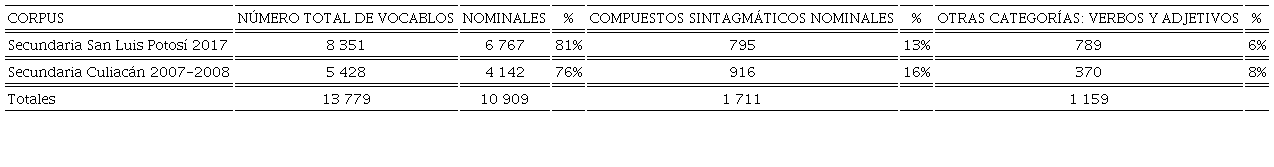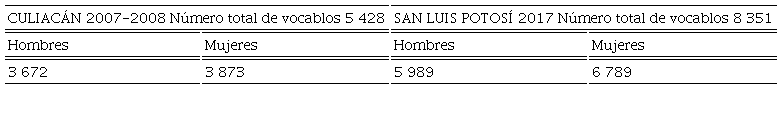 Como ya se explicó en párrafos anteriores, el corpus de estudiantes de secundaria de Culiacán se obtuvo entre 2007-2008 y se presentaron los resultados hasta el 2014. Sobre el total de palabras recolectadas, este corpus generó 23 804 palabras distribuidas en dos variables claramente identificables: sexo y centro educativo. Sobre los resultados de la variable sexo en mujeres, se generaron 12 431 tipos, mientras que en hombres se obtuvieron 11 374 tipos. Referente a los resultados de los centros educativos, los hombres de la escuela privada generaron 6 849 tipos y en escuela pública 4 524, mientras que las mujeres en la escuela privada produjeron 7 369 tipos y en escuela pública, 5 062. En lo que respecta al corpus potosino, este fue aplicado a estudiantes de secundaria, además, la muestra se obtuvo en 2017.