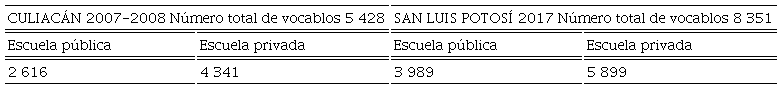 Al comparar los resultados de los centros públicos y privados de ambos corpus, se observa que, en el corpus de San Luis Potosí, es más frecuente en 1 373 vocablos (9.9%) en escuela privada y en 1 558 (11.3%) en públicas. Sobre el total de los vocablos de los corpus y su distribución en los corpus encontrados, obsérvese la siguiente tabla comparativa.