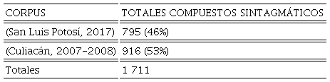 Al analizar los resultados de los vocablos generales, se reconoce una diferencia de 2 923 vocablos más en la muestra de San Luis Potosí que en la de Culiacán, lo que representa un 21% de incremento. Se esperaría que, por la temporalidad entre los corpus, aparecieran más compuestos sintagmáticos en el corpus 2017. No obstante, hay un decremento de 121 compuestos (7%). Es decir, el total de compuestos sintagmáticos tuvo un fenómeno de constricción, en oposición a los resultados especulados.