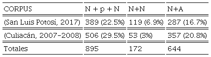 Si se considera la temporalidad de obtención entre un corpus y otro, se puede observar una diferencia en la totalidad de elementos obtenidos: 121 compuestos más para la muestra de Culiacán. Esto representa 7% de diferencia entre un corpus y otro. Sobre la diferencia entre los corpus por la estructura (N + p + N)N, el corpus de Culiacán presentó mayor número de compuestos de este tipo que el de San Luis Potosí, lo que representa una disminución de 117 compuestos. Esto refleja una contracción de 7% sobre la totalidad. Sobre el análisis de los compuestos del tipo (N+A)N, también existe un decremento de 70 compuestos en la muestra de San Luis. Si se comparan los corpus por su temporalidad, la contracción es de 4%, un porcentaje bajo para 10 años de diferencia.