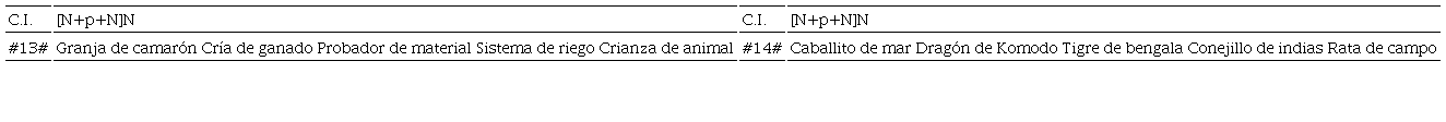 En lo que respecta a los compuestos [N+p+N]N, estos se reconocen como los más prototípicos que aparecen en las dos listas de disponibilidad léxica. Para su comprensión, la ausencia de significado composicional es el factor fundamental para que pueda ser reinterpretada sintácticamente como nombre complejo (Val 1999). El núcleo presenta características semánticas propias del compuesto, entre las que destacan +/-humano, que aparece en el núcleo y +/- especificativo, que aparece en el determinante. Además de lo anterior, los compuestos sintagmáticos presentan unicidad semántica y referencial que propician el funcionamiento como unidades simples y presentan frecuencia alta en los listados de disponibilidad léxica (Sánchez-Saus 2011). Como ejemplo de esto, se presenta la distribución de este tipo de compuestos en los centros de interés #13# Trabajo de campo y jardinería y #14# Los animales.6