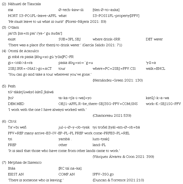Otro aspecto particularmente remarcable del libro es la amplia y sustanciosa contribución descriptiva que contiene. Para contextualizar la caracterización de las RSN en cada lengua estudiada, antes de cada capítulo los autores brindan un panorama gramatical de la lengua que incluye: componentes y rasgos distintivos de sus cláusulas declarativas vs. interrogativas, estrategias de subordinación, estrategias de relativización, elementos wh y pronombres relativos, complementantes vs. relativizadores, estructuctura de las FD/FN, listado de determinantes, cuantificadores y demostrativos, expresión de la (in)de fi ni tud, estructura y componentes de las frase verbal, marcación de TAM e (in)transitividad. En varios capítulos también se incluye información sobre el orden básico de constituyentes en la lengua estudiada, su marcación de sujeto vs. objeto, su alineación tipológica y la estructura de sus clases de palabras básicas -sustantivos, pronombres, verbos y adjetivos-. Asimismo, cada capítulo incluye informaciones adicionales necesarias, como el sistema de tonos del zapoteco de San Pedro Mixtepec (Antonio-Ramos 2021), los sufijos de estatus del k'iche' (Can Pixabaj 2021), o los marcadores enclíticos de predicado del pesh (Chamoreau 2021).