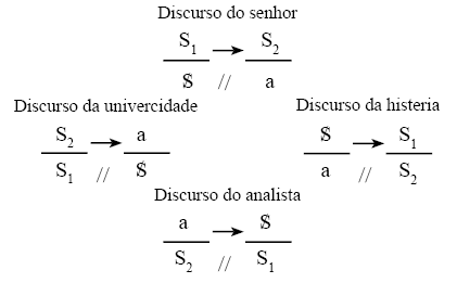 No Seminário XVII, Lacan (1969-1970/1992) tenta abordar, através dos discursos, os laços sociais possíveis apesar do real impossível. O discurso é uma tentativa de estabelecer um laço social com o outro que decorre de uma perda de gozo. Essa perda implica na própria entrada no discurso. Lacan sugere a existência de quatro discursos que regulam o laço social: o do mestre, o da histérica, o do psicanalista e o do universitário. Afirma que todo discurso compreende quatro elementos, que são seus matemas fundamentais: S1, o significante mestre; S2, o saber; a, mais-de-gozar; e $, sujeito barrado pelo significante. Esses elementos obedecem a uma sequência ordenada que não pode ser desarrumada. Ao seguir essa ordem, eles podem mudar de lugar – quatro giros – adquirindo uma nova função no discurso. É a partir dessas rotações que se obtêm os quatro diferentes discursos.