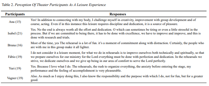 Question two asked the participants if they perceived their participation in the theatre ministry to be leisure (see Table 2). Most participants did indeed perceive their participation in the theatre ministry as a leisure (Ana, Isabel, Bruna, Yuri). For Vagner, as indicated by his use of the word “also”, participation in the theatre ministry was leisure but it was also more than leisure “I also know the responsibility and the purpose with which I do [the theatre], not for the fun, but for the greater good”. Thus, for Vagner the theatre was both leisure and a ministry responsibility. Fábio was the only participant who did not consider the theatre ministry leisure “I do not consider it a leisure moment”.