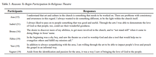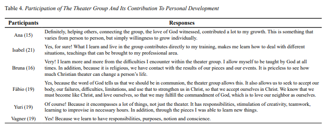 Finally, participating in the theater group in the religious context, according to the data presented, contributed to the personal development of young people in this study. We recognize the relevance of theater as a pedagogical medium that contributes to the promotion of different skills such as communication, self-expression, creativity, and socialization. But we also identified that for two of the participants, participation in the theatre group led to spiritual growth and development.