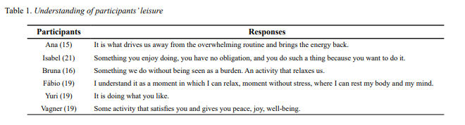 The first interview question asked the participants for their understanding of leisure (see Table 1). Two of the participants included the word “activity” in their understanding of leisure. Bruna described leisure as “an activity that relaxes us”, while Vagner defined leisure as “some activity that satisfies you.” Two other participants, who did not include the word “activity” in their definitions, alluded to the idea of leisure as activity as they explained that leisure was something that they did. Isabel defined leisure, as “something you enjoy doing,” while Yuri stated that leisure “is doing what you like.” Bruna, who had described leisure as activity also said that it was “something we do.” In contrast, Fábio defined leisure in terms of a time “a moment in which I can relax, moment without stress.” The one other participant did not define leisure in terms of an activity or a period of time, but rather in terms of leisure’s function or outcome “it is what drives us away from the overwhelming routine and brings the energy back” (Ana).