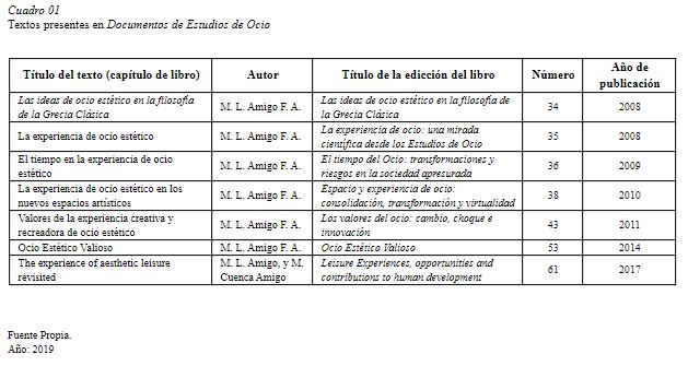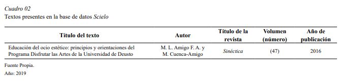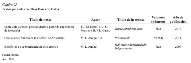 Aunque este texto se base en una revisión bibliográfica en dichas revistas, sabemos que eso no nos permite afirmar que podemos contemplar toda la producción sobre el ocio estético o definir la experiencia de ocio estético con puntos finales y con martelos sobre la mesa. Además, la autora Amigo y demás autores singuen en reflexión y producción sobre la temática. De este modo, afirmamos que el presente texto es una producción parcial sobre la experiencia de ocio estético, y que jamás estará cerrado.