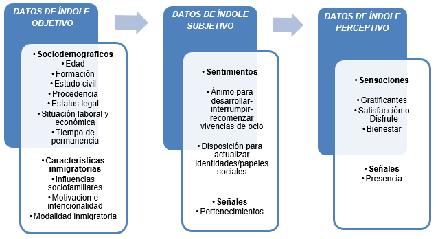 El ámbito relativo al ocio que procede de la identificación con la experiencia, comporta características que ayudan las protagonistas encontrar el sentido de Ser inmigrante; del ocio por la confluencia entre culturas, favorecen el encuentro de las significaciones de Estar, o sea, sus vinculaciones al entorno cultural/sensación de pertenecer o sea, el reconocimiento de las ajustadas interacciones interpersonales que actualizan y desarrollan sus identidades en pro de la integración. Para atenerse a las dimensiones del ocio, hay que admitir la inexistencia de una perfecta dinámica de integración de inmigrantes, que no se contabiliza como un cálculo establecido entre estar o no integrado; esto significa -basado en políticas formales de encuadre cuantitativo de la integración- asentar bases de los planteamientos regulados en términos de incapacidad y no de las índoles de saludables de integración.