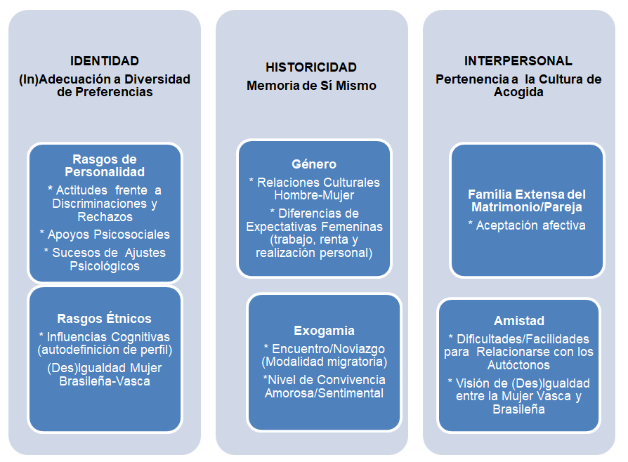 Para identificar qué y cuáles posiciones de integración distinguen las protagonistas, se comprueba que tienen el dominio de sus vivencias en pro de una percibida libertad en elegir/tomar consciencia de lo que les sean más gratificante y satisfactorio; otro índice de comprobación de éxito en el alcance de grados de integración se refiere a identificarse una mejoría en calidad de vida entre la que tenían en Brasil y ahora perciben disfrutar en Bilbao. En vista a la integración, aparecen la disponibilidad y disposición para conocer, respetar y aprender con/en la cultura vasca; desde ahí, son capaces de identificar formas de actuación que armonizan los estilos de vida que tenían en Brasil y actualizan en Bilbao, releyendo lo que allá habían aprehendido con valoraciones ante la cultura vasca.