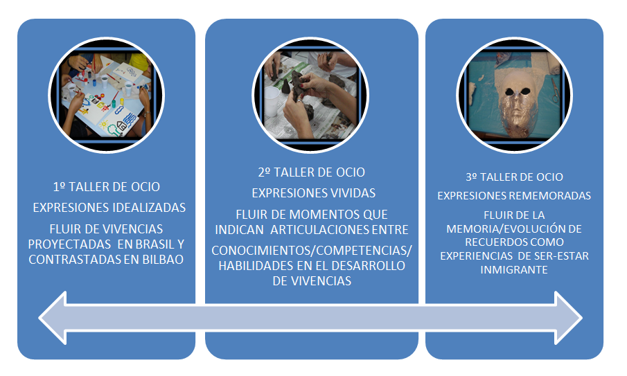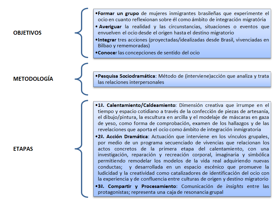 En distinguir la Metodología de la investigación en tres etapas, escrita (encueta), hablada (entrevista) y expresada (talleres de ocio) se está disponiendo técnicas de recogida de datos que ha posibilitado a las mujeres inmigrantes traer consciencia y comunicar sentimientos-sentidos (relecturas ‘ido”, vivencias ‘siendo’ y proyecciones ‘advenido’) como ocio en ámbito de integración, o sea, ratifica momentos-presencia y proximidades-pertenecer que les han permitido ‘ser igual desde su alteridad-diversidad’. El método de experimentar el ocio en cuanto se refleja sobre él, favorece al inmigrante memorizar los sentimientos placenteros y las sensaciones agradables referentes a la vivencia emprendida; el modelo diseñado que ha permitido la intervención y el análisis para el reconocimiento de sentido del ocio se ha aplicado empíricamente al dominio de las interacciones y relaciones que protagonizan las mujeres inmigrantes brasileñas que viven casadas o en pareja mixta con hombres de origen vasco en Bilbao.