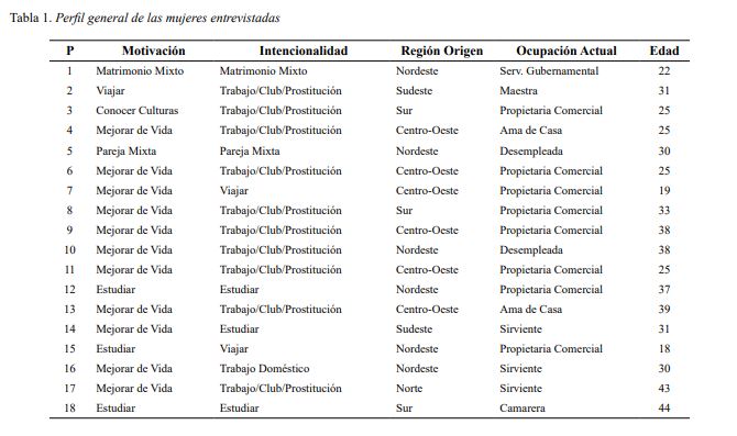 Del perfil de las mujeres investigadas se obtiene el siguiente extracto: lo más frecuente (61%) es venir motivadas por la mejora de la vida, aunque la idea de progresar (55%) esté íntimamente unida a ejercer la prostitución o trabajar en clubes de alterne; de este universo, 74% proceden sobre todo de las regiones deprimidas del Centro-Oeste, Nordeste y Norte de Brasil. Un dato del cruzamiento entre tiempo de estancia en el País Vasco (45% entre 06-10 años) y ocupación/trabajo actual, destacase 77% como económicamente activas, siendo que el 57% desarrollan actividades como propietarias de su propio comercio (peluquería, bar-restaurante y club nocturno) siendo que la edad representativa está en la franja de 19 hasta 37 años. Con el paso del tiempo, las mujeres que vinieron a dedicarse a la prostitución/bailarinas/alterne en clubes, han abandonado estas prácticas y mayoritariamente han conseguido tener su propio negocio; otras ejercen una profesión o se dedican a su casa; del total, 11% están en el paro-desempleadas.