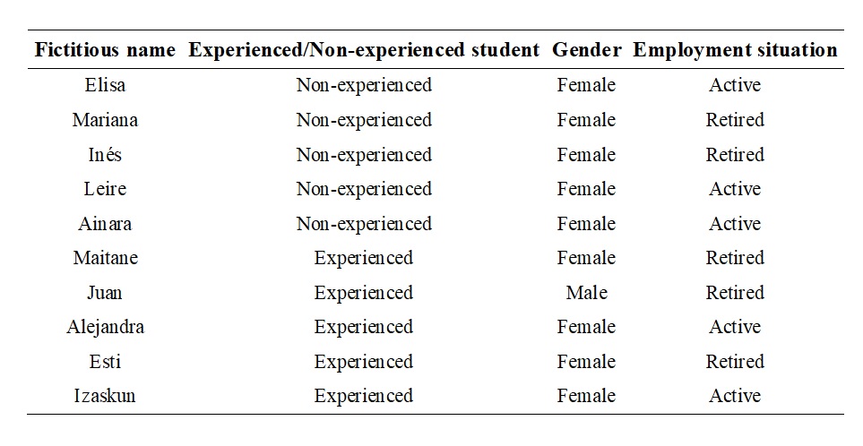The number of students enrolled in the opera module of the programme “Enjoy the Arts” during the academic course 2012-2013 was 49; some of them had been attending the course for several years, whereas others had just started. The main criterion we considered was selecting a mixed sample of experienced and non-experienced students. In addition, gender was considered. Within the group of 49 students, seven were men (14%). In our sample, one of the interviewees was a man (10%), and nine were women. Table 1 summarises the selected sample. Real names have been replaced by fictitious names, respecting the participant’s gender, to maintain the confidentiality of the answers.