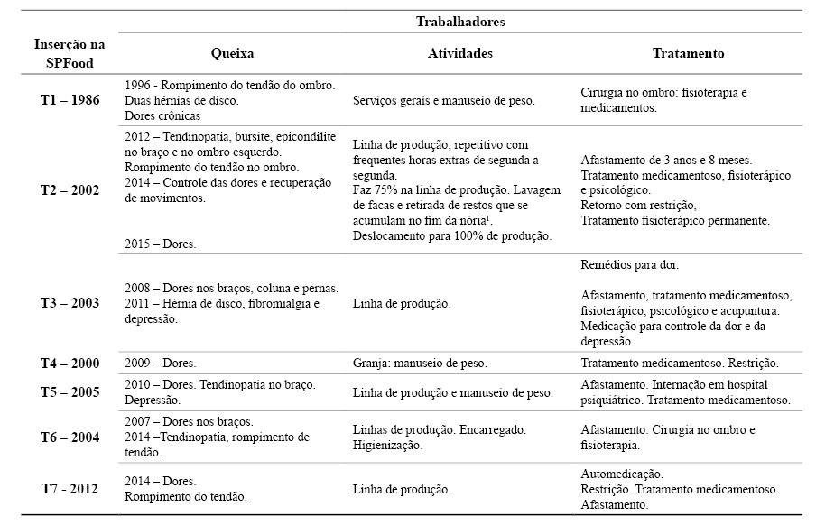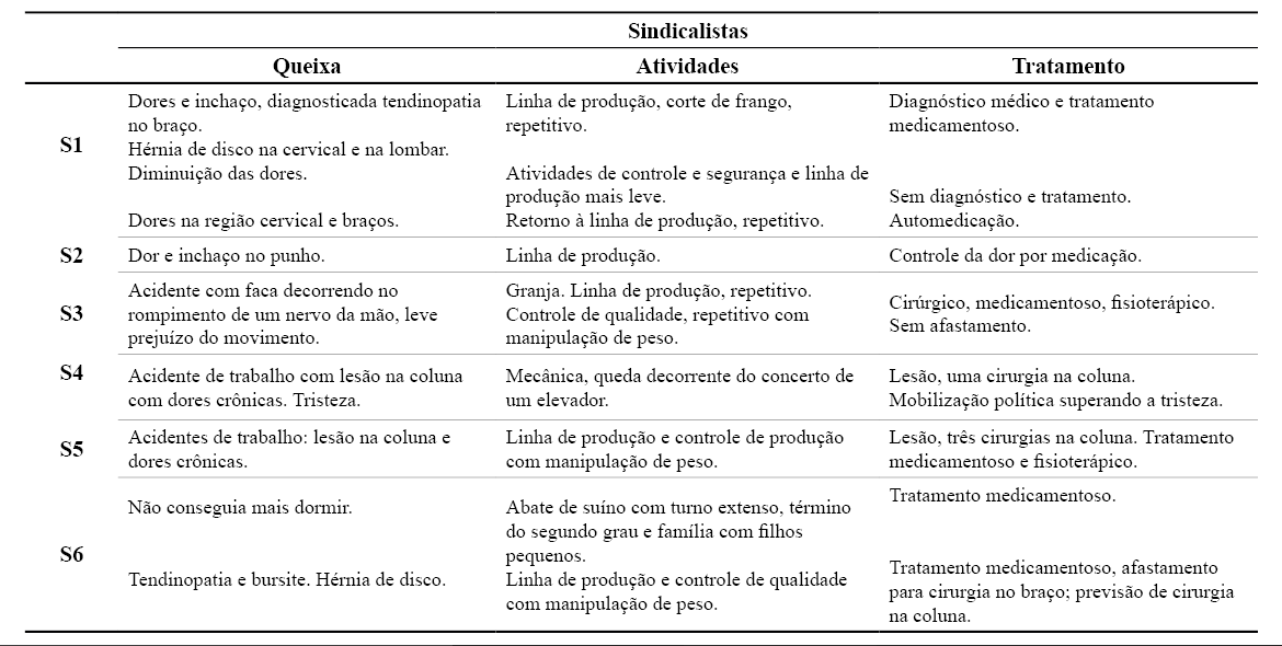 Podemos identificar na tabela 1 que todos(as) sindicalistas entrevistados ligaram as dores e o desenrolar do adoecimento com as atividades que desenvolvem ou desenvolveram no contexto de trabalho da SPFood. Tais entrevistas foram conduzidas objetivando a compreensão do contexto, entretanto aspectos biográficos foram ressaltados pelos entrevistados. Na tabela 2, os aspectos biográficos, inclusive a cronologia, foi mais visada.