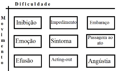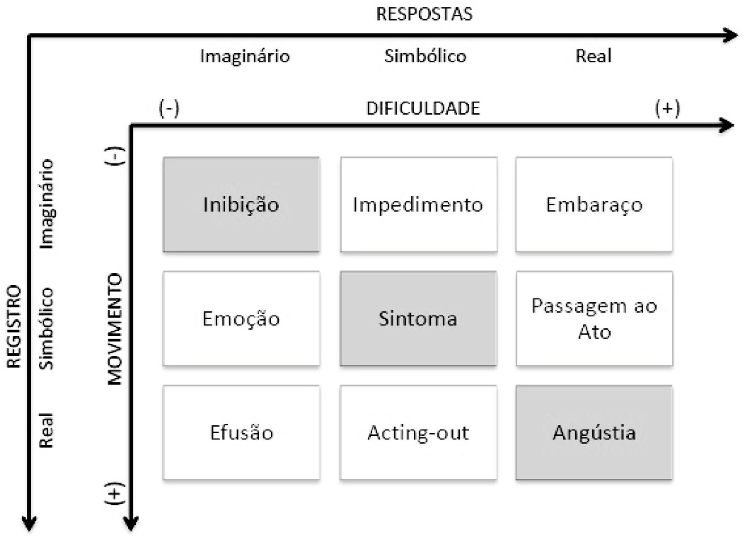 Ele propõe também dois eixos: um diz respeito à movimentação do sujeito e o outro diz respeito à dificuldade do sujeito. No entanto esse esquema pode ser visto de maneira atualizada. Calazans (2015), p. 126) propõe uma duplicação e acrescenta ao lado do vetor movimento os registros: imaginário, simbólico e real. Do lado da dificuldade, acrescentam-se as modalidades distintas de respostas que se dão sobre esses três registros (Figura 4).