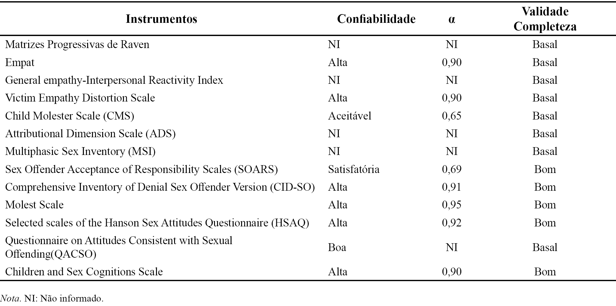 Para delinear um quadro síntese de indicadores de apreciação dos instrumentos, seguiu-se a orientação apresentada por Paixão e Reichenheim (2006), que propõem a avaliação do histórico de cada instrumento, que eles denominam de completeza. Assim, para avaliar os instrumentos reportados nas publicações revisadas neste artigo, deve-se considerar a completeza que inclui uma apreciação sobre o acúmulo e aprofundamento dos estudos de confiabilidade ou validade do instrumento na literatura.