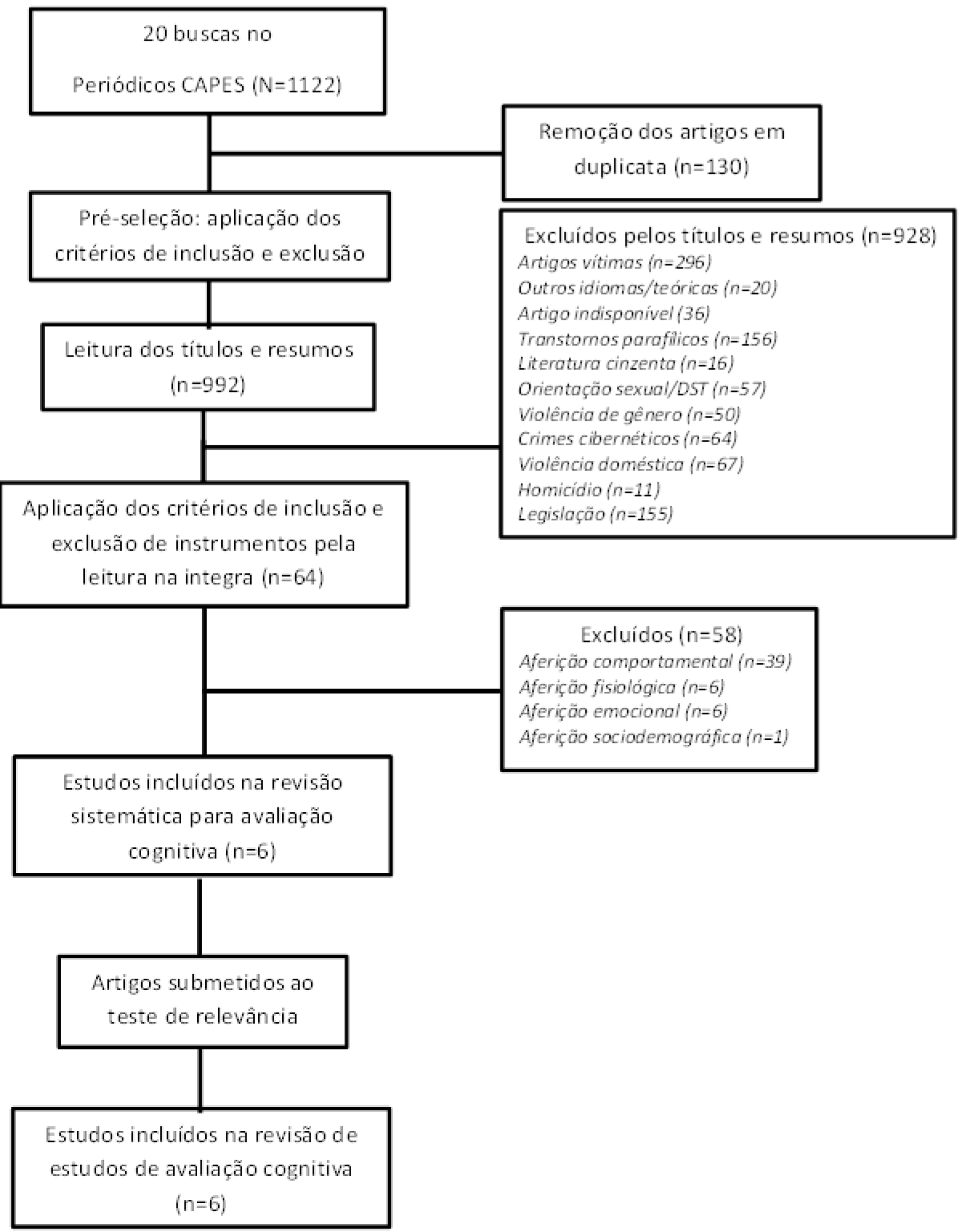 Critérios de inclusão e exclusão foram delimitados para a realização das buscas dos artigos científicos no Portal de Periódicos da CAPES. Para inclusão: artigos publicados em português e inglês; nos últimos 30 anos completos e empíricos; que envolvessem somente AASCA; de AASCA acima de 18 anos de idade; que utilizassem instrumentos de avaliação cognitiva. Para exclusão: literatura cinzenta (por exemplo: documentação técnica, anúncio de jornais, entre outros); teses, dissertações e demais trabalhos de conclusão de curso (TCC); artigos teóricos e de revisão sistemática de literatura; artigos com ênfase na sexualidade e em doença sexualmente transmissível; estudos que envolviam especificamente vítimas de agressão sexual; artigos que apresentavam no título termos que representam tipos específicos de AASCA: pedófilo, psicopatas, aliciador, traficante sexual, explorador sexual; e estudos com animais não humanos.