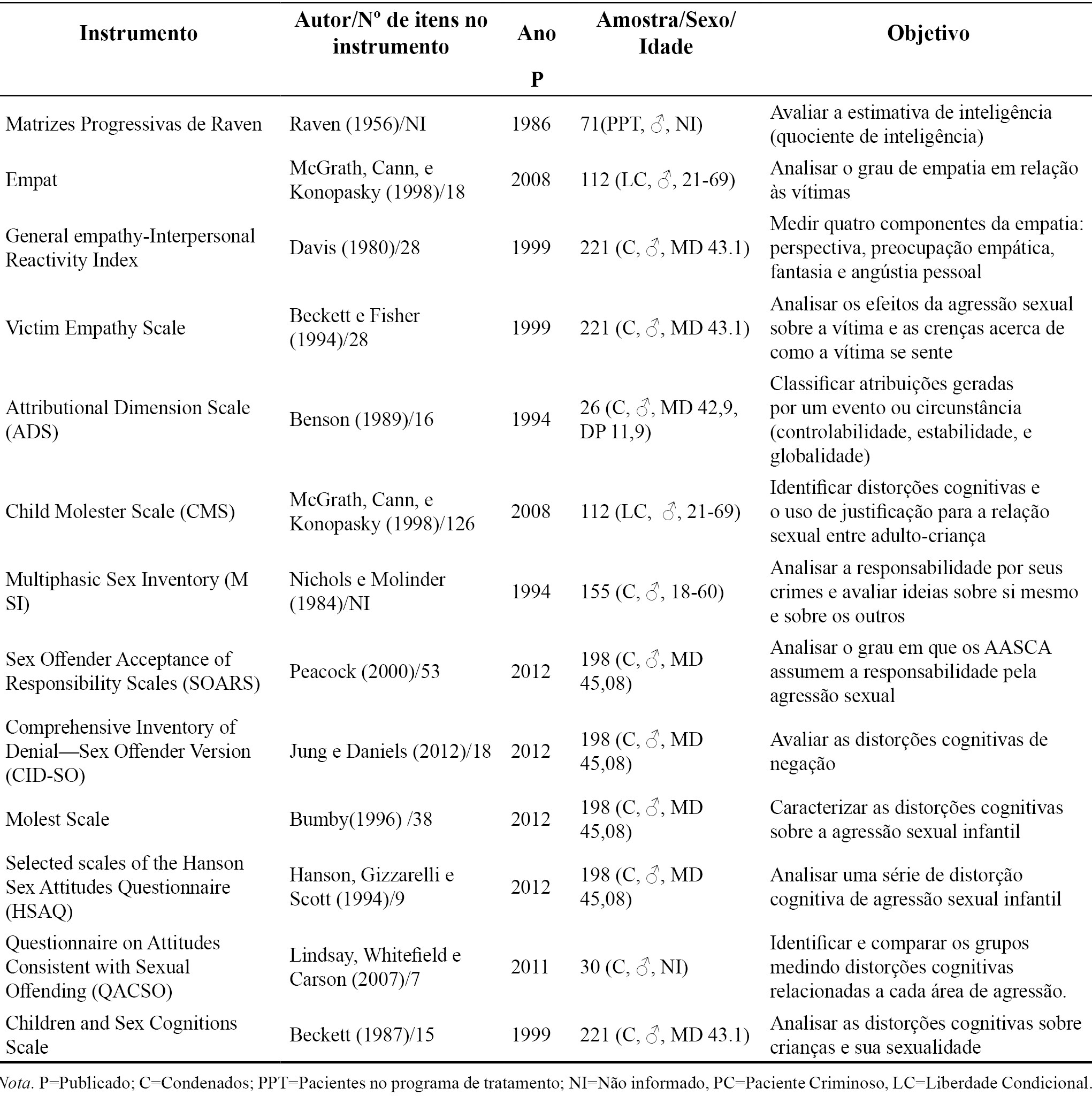 Abstract: The objective of this review was to identify and describe the psychometric measures of cognitive evaluation instruments of authors of sexual aggression against children and adolescents, scientifically validated, found in studies that investigated intelligence, empathy and cognitive distortion, in the national and international literature, available in the source of data in the Portal de Periódicos da CAPES (Coordenação de Aperfeiçoamento de Pessoal de Nível Superior). As criteria of eligibility, terms in Portuguese and English, sexual aggressor, sexual abuser, sexual perpetrator, sexual rapist, sexual molester, were used. In a total of 1122 articles, 58 were selected for review and in them 13 cognitive evaluation instruments: intelligence quotient checking(1), empathy evaluation (2), and cognitive distortion (10). Among the psychometric properties reported, six of the instruments found exhibited a high reliability index. When comparing the instruments of intelligence, empathy and cognitive distortion, it is noticed that the results point to measures of high reliability and completeness between the latter. The international literature on the subject has been gaining visibility in the scientific field; however, there are still few methods and research instruments aimed at the cognitive evaluation of this population in Brazil.